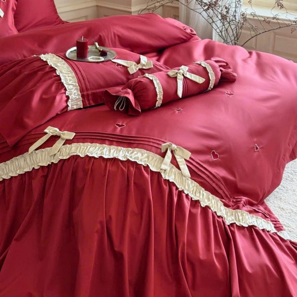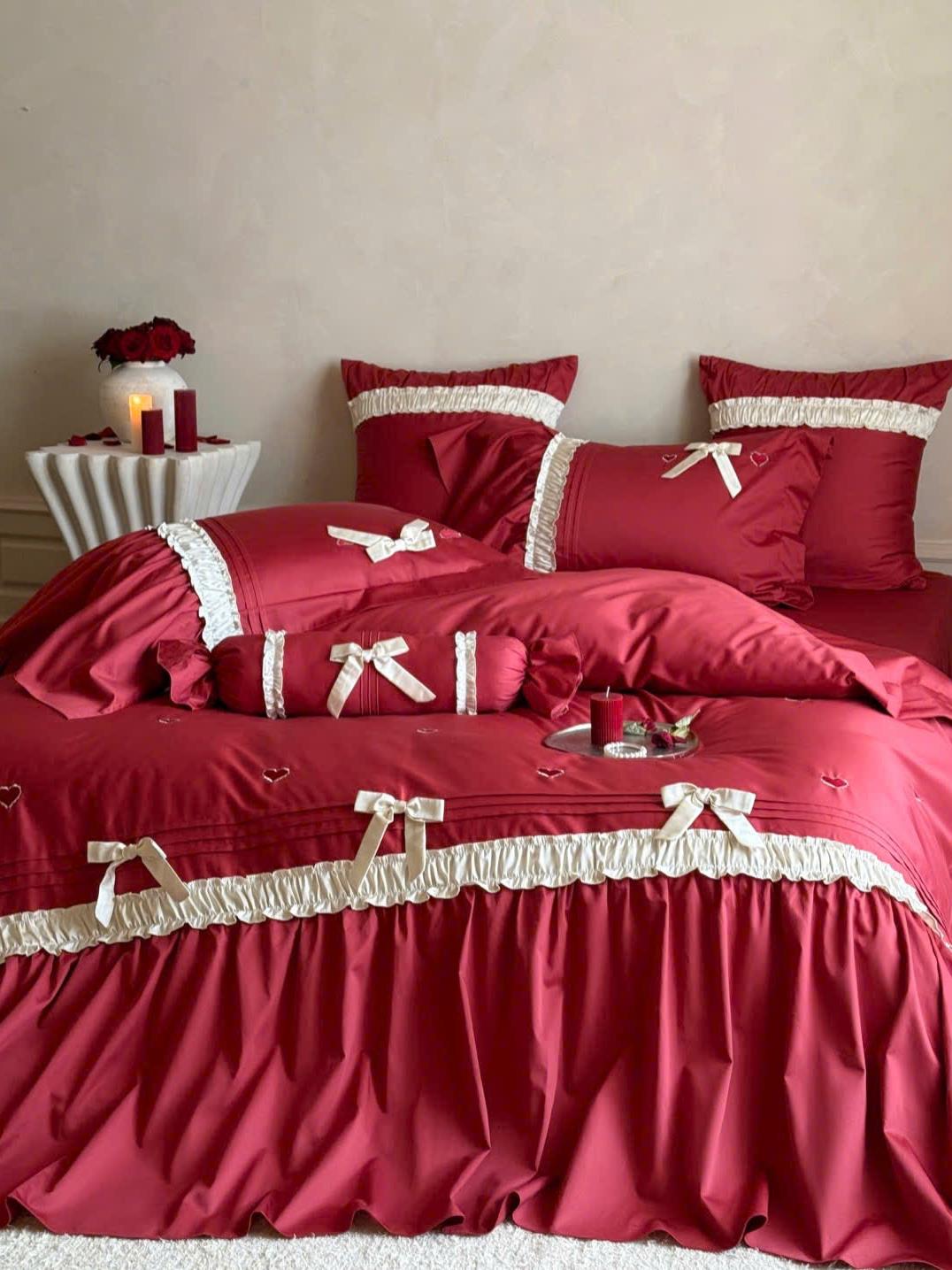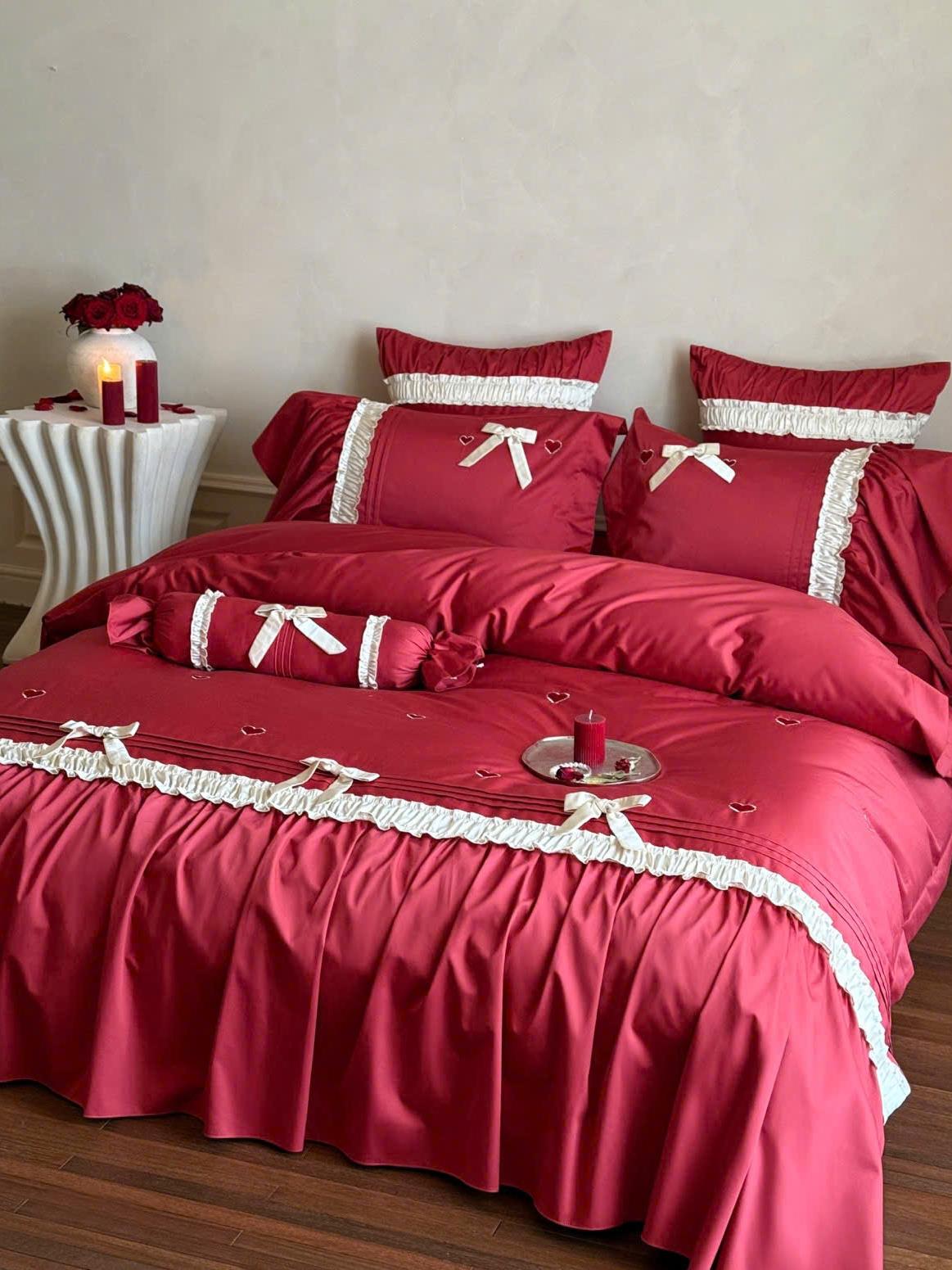 Thẻ: Chăn ga gối cotton mercerized, Chăn ga gối cưới lãng mạn, Chăn ga gối đỏ trắng, Chăn ga gối phong cách Pháp, Chăn ga gối trái tim thêu, MOYA HOME chăn ga gối