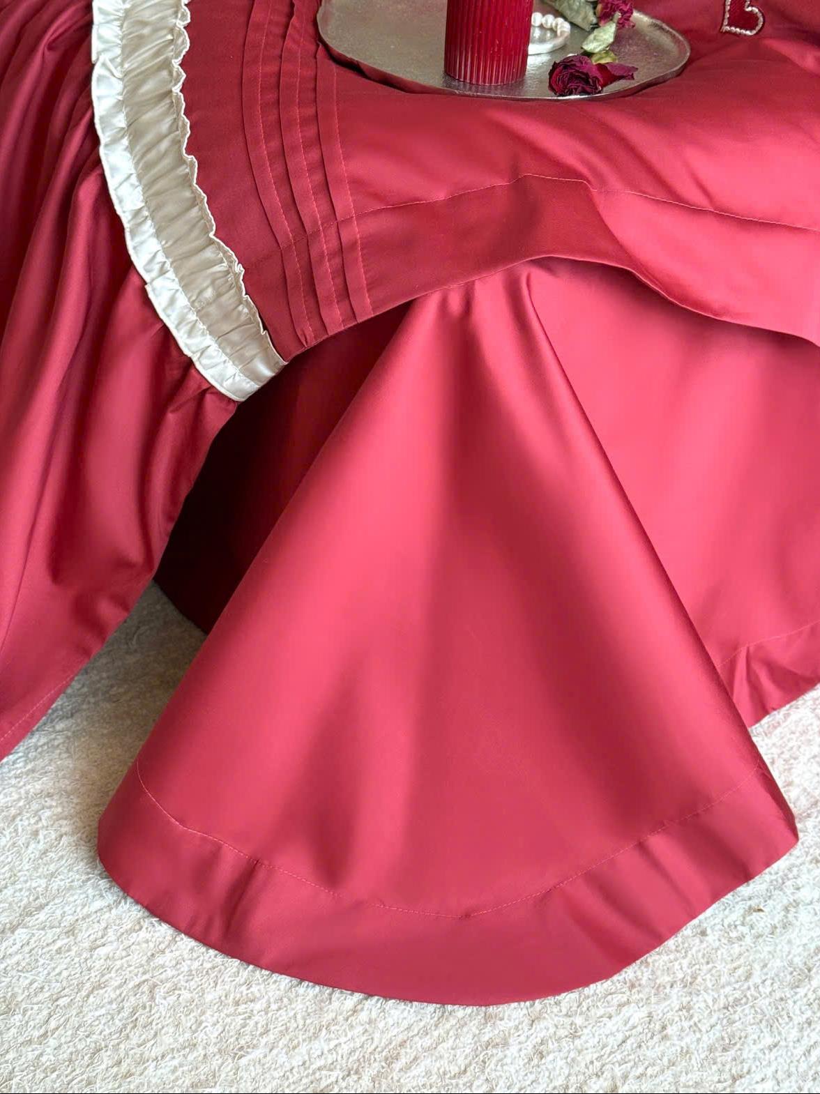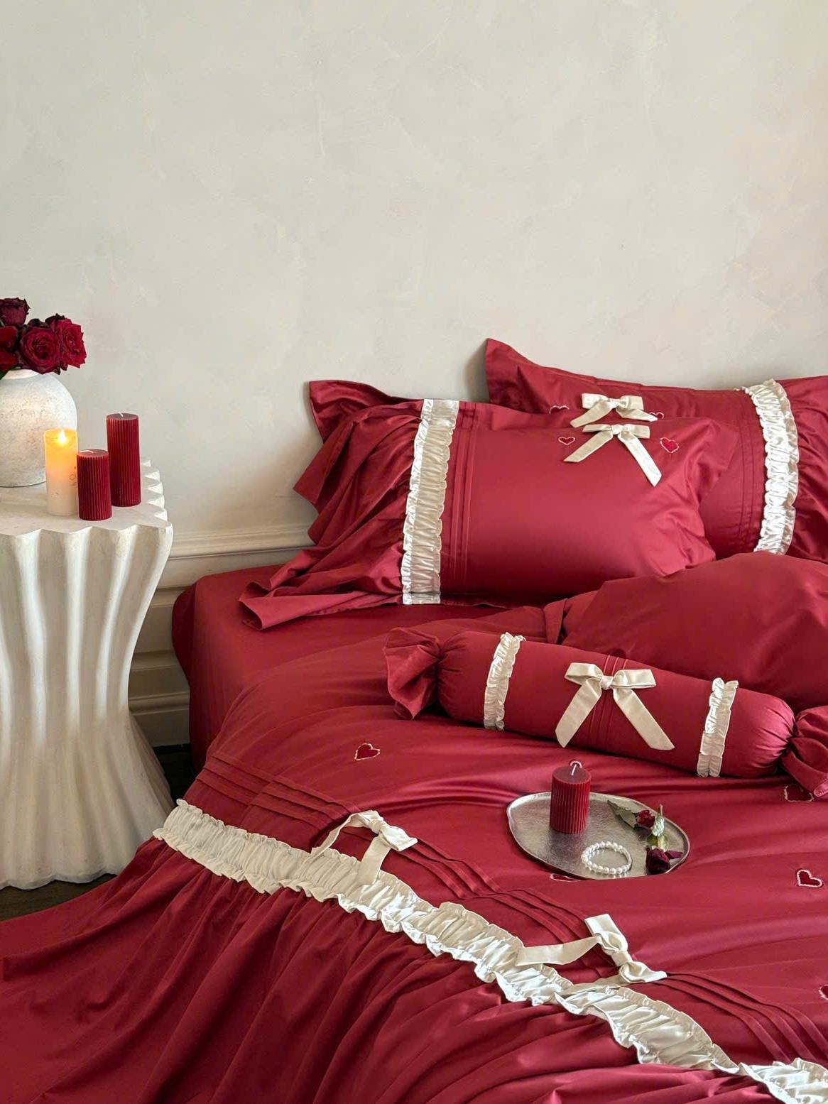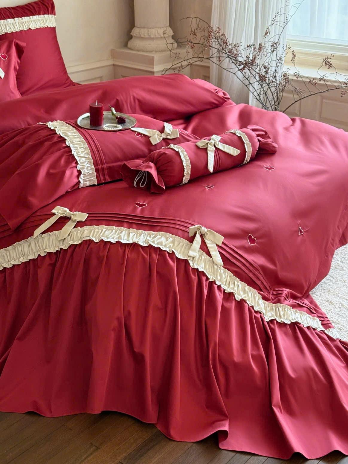Thẻ: Chăn ga gối cotton mercerized, Chăn ga gối cưới lãng mạn, Chăn ga gối đỏ trắng, Chăn ga gối phong cách Pháp, Chăn ga gối trái tim thêu, MOYA HOME chăn ga gối