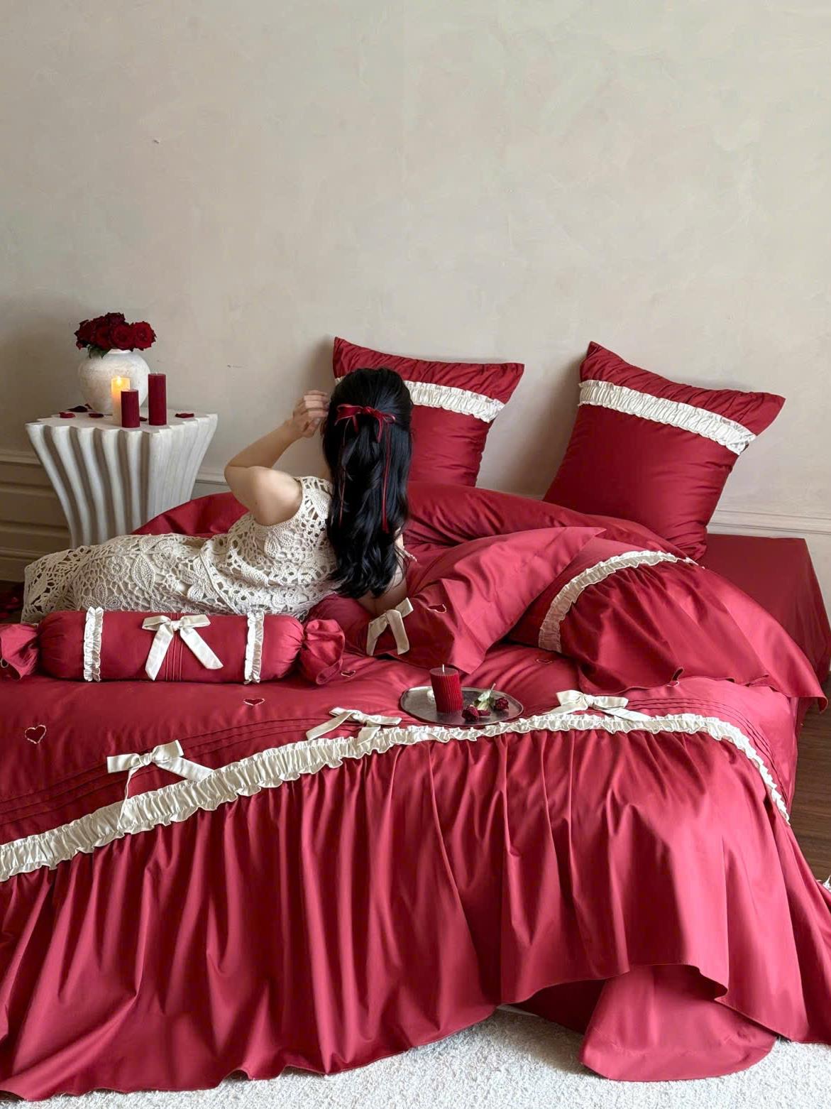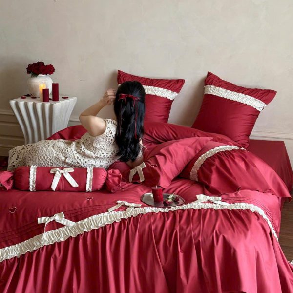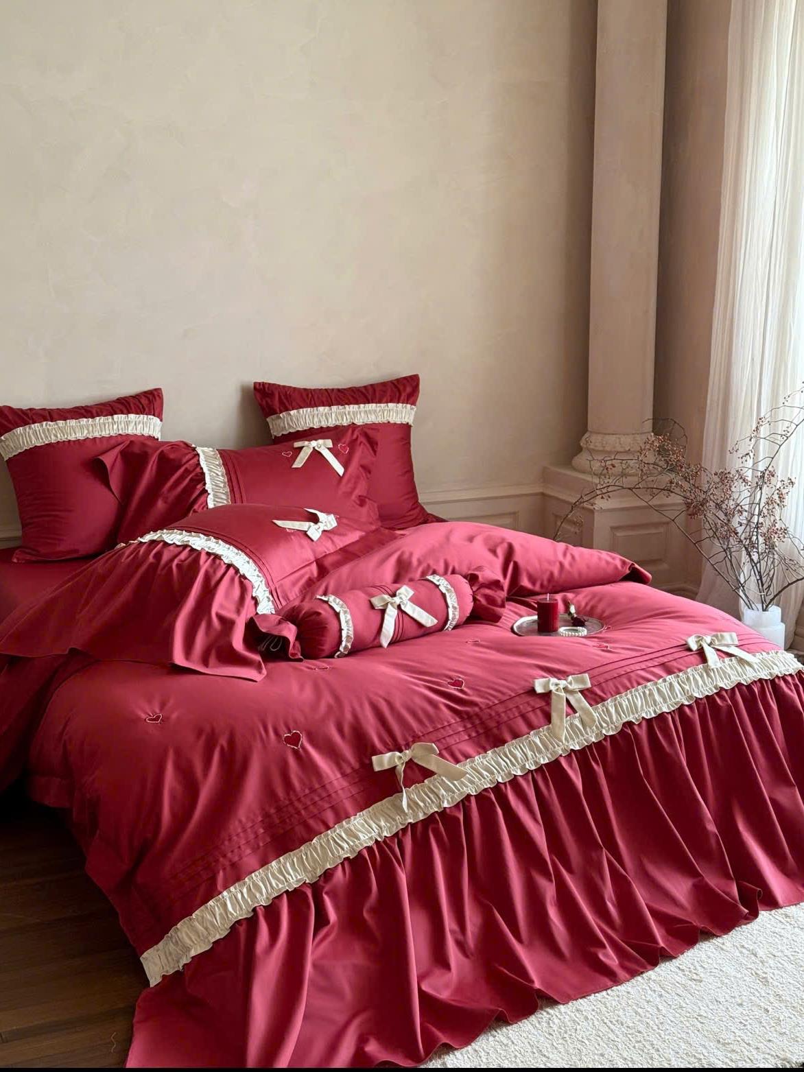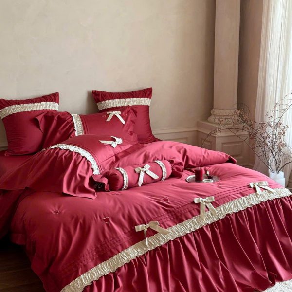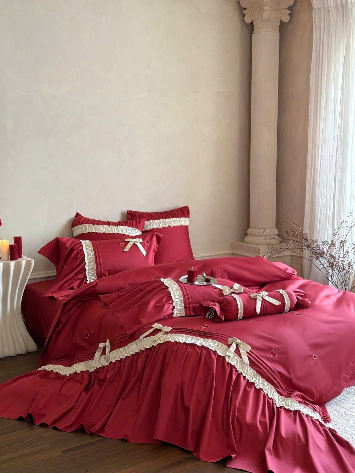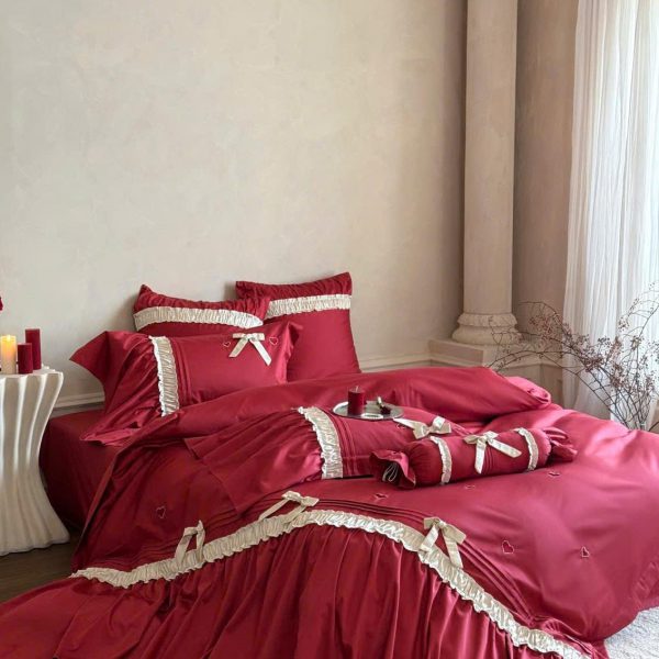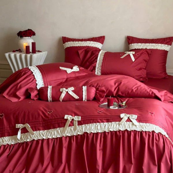 Bộ chăn ga màu đỏ rực rỡ, tượng trưng cho tình yêu nồng nàn và hạnh phúc viên mãn.